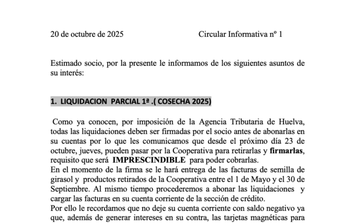 DISPONIBLE LA PRIMERA LIQUIDACIÓN CORRESPONDIENTE A LA COSECHA 2025 FIRMA A PARTIR DEL JUEVES 23 DE OCTUBRE INGRESO EN CUENTA A PARTIR DEL VIERNES 24 DE OCTUBRE Pueden verla es su zona de usuario.